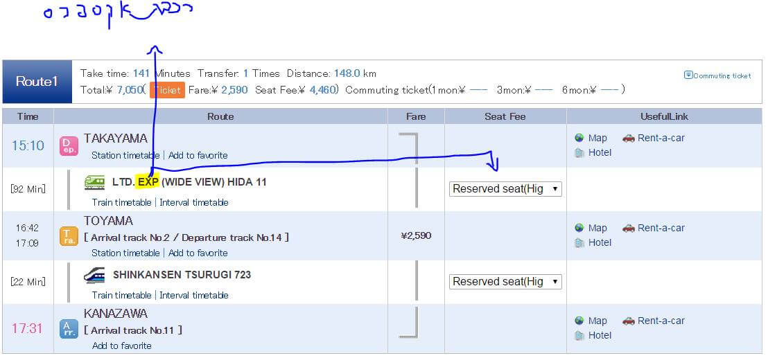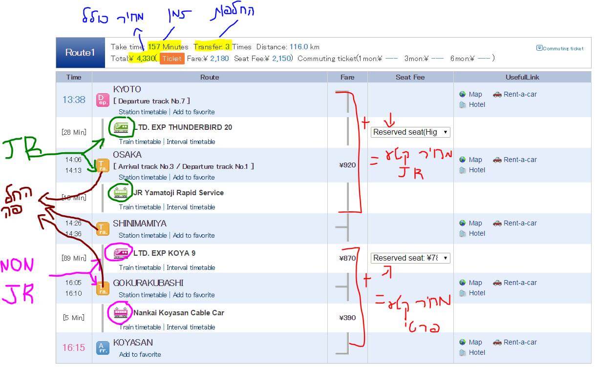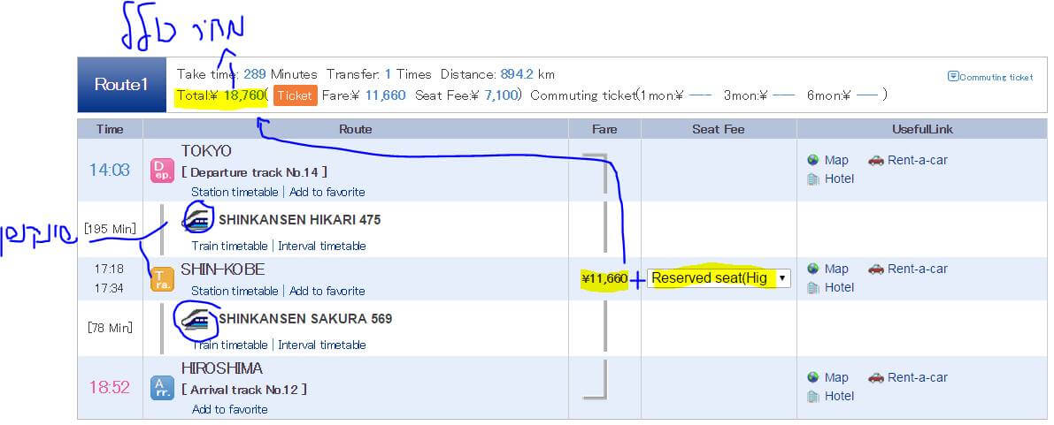 ה. שימו לב למחיר: המחיר הסופי של כל המסלול מופיע בצד שמאל למעלה. אם המסלול מחולק למקטע של JR ומקטע של רכבת פרטית, אז לכל מקטע יופיע בצד ימין המחיר לאותו מקטע *אך מחיר זה אינו כולל את מחיר הreserved seat, שהוא מגולם במחיר הסופי שמופיע למעלה.