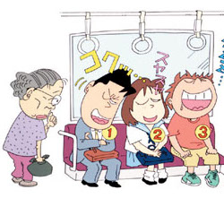 - אדיבות: תן את המושב שלך לזקנים , נשים בהריון ונכים – הם יסרבו לכם כמה פעמים בהתחלה אבל אל תטעו הם אכן רוצים את המושב – ככה זה המנטליות ביפן, לכן נהוג פשוט לקום ולהתרחק כדי שירגישו בנוח.