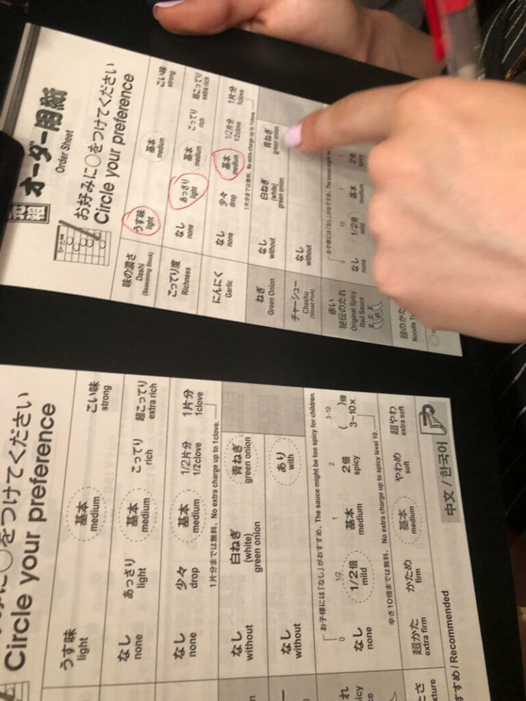 המלצה ראשונה לראמן מצוין- ichiran Ramen!!! הראמן הוא בעצם מרק איטריות יפני מסורתי עם חזיר (ישנן מסעדות אחרות שמגישות את הראמן עם בשר שונה). למסעדה יש מספר סניפים ברחבי יפן, אז כדאי פשוט לבדוק את הסניף הקרוב ביותר אליכם. אכלנו במקום מספר פעמים ונהננו מאוד (גם טוקיו וגם אוסקה). הסניפים בטוקיו שונים קצת מהסניף באוסקה, בסניפים בטוקיו ישנה מכונה בכניסה שבה בוחרים מה מעוניינים לאכול (יש עוד אפשרויות חוץ מראמן), מכניסים כסף למכונה ומקבלים פתק קבלה. לאחר מכן נכנסים לתוך המסעדה וממלאים טופס שבו מציינים איך אתם מעוניינים לאכול את הראמן שלכם (מידות עשייה, תוספות מסוימות וכו'). השהות במסעדה מיוחדת כבר בפני עצמה, כל סועד יושב בתא נפרד לאכול והאוכל מוגש דרך המטבח בצורה ייחודית. בדרך כלל יש קצת תור למסעדה, אך זה תלוי מאוד בשעה והתור עובר מהר מאוד וכמובן ששווה את ההמתנה.