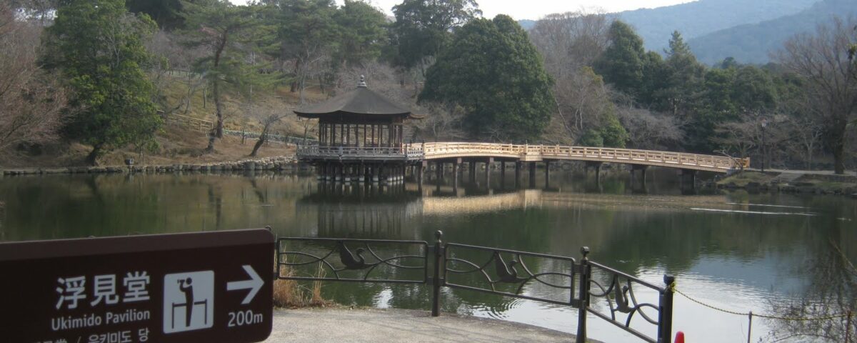 מקום מנוחה בצורת משושה יושב מעל שפת בריכת Sagiike בפארק נארה. הנוף של אסג'יגארה ברקע יפהפה. האזור נצבע על ידי פריחת דובדבן באביב ועלי השלכת בסתיו.