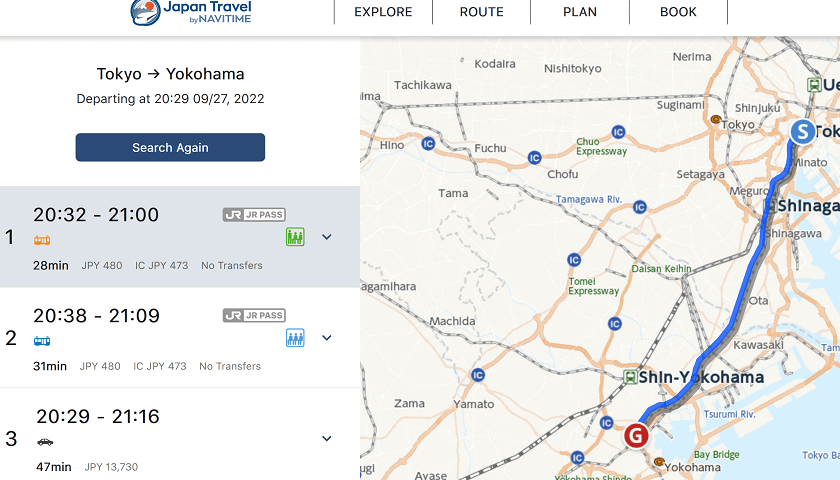 לחיצה על אחת התוצאות תפתח את הפרטים המלאים של אותה תוצאה. למשל, בדוגמה למעלה בוצע חיפוש לנסיעה מטוקיו ליוקוהאמה. התוצאה שנבחרה היא הראשונה ופירוט הנסיעה מוצג בתמונה הבאה: